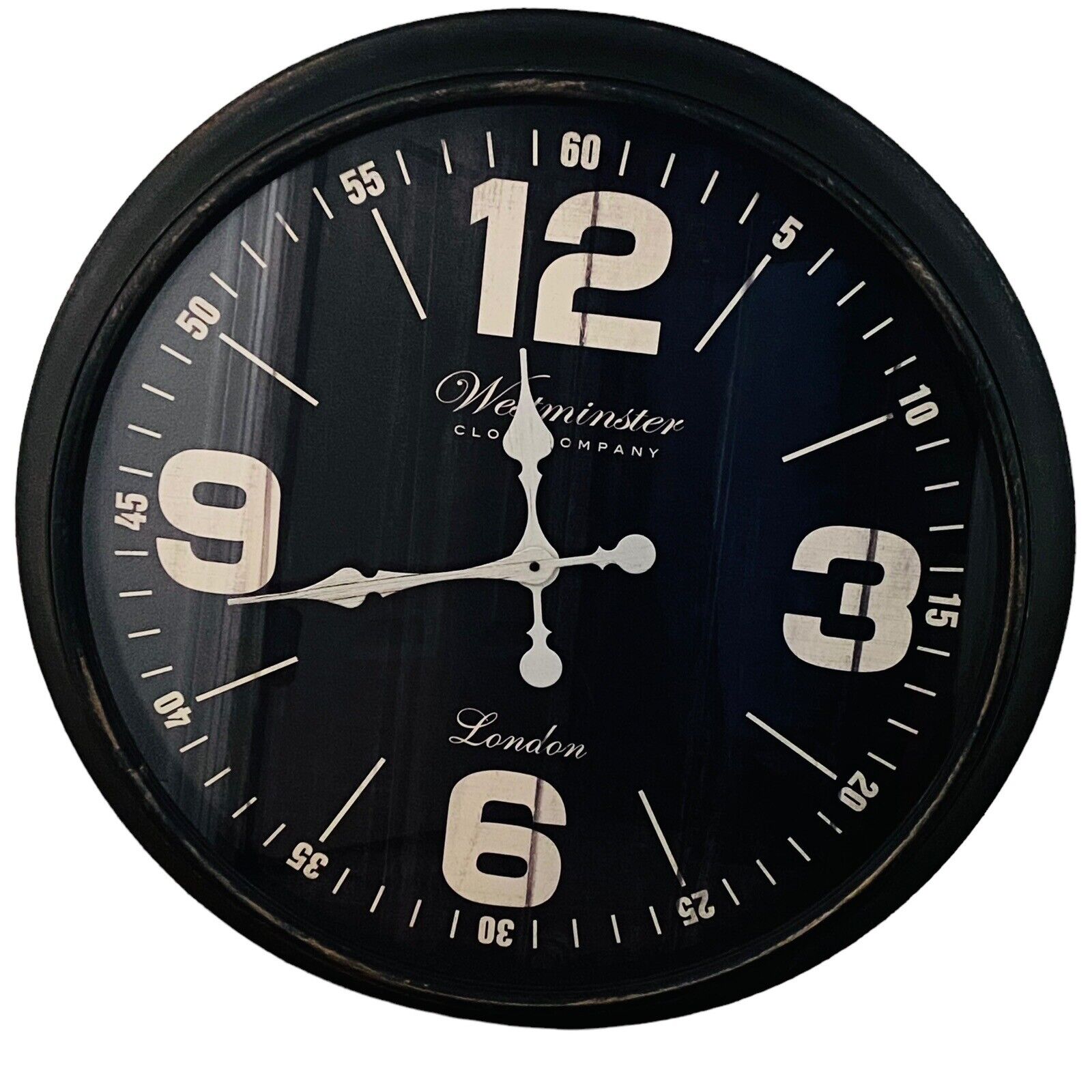 Accurate quartz timing with glass lens 30" wall clock makes for a bold statement piece. Battery-operated for placement in any room.