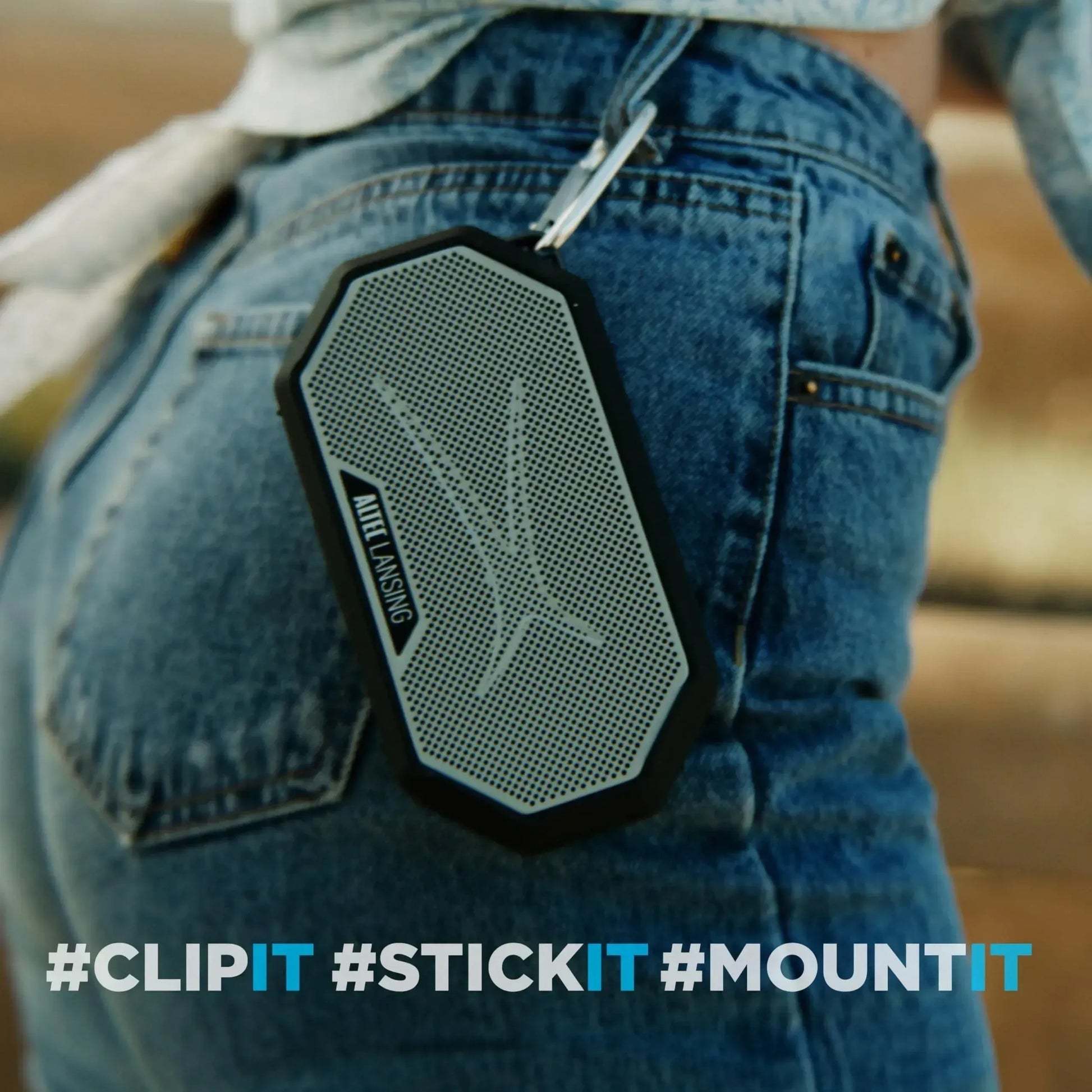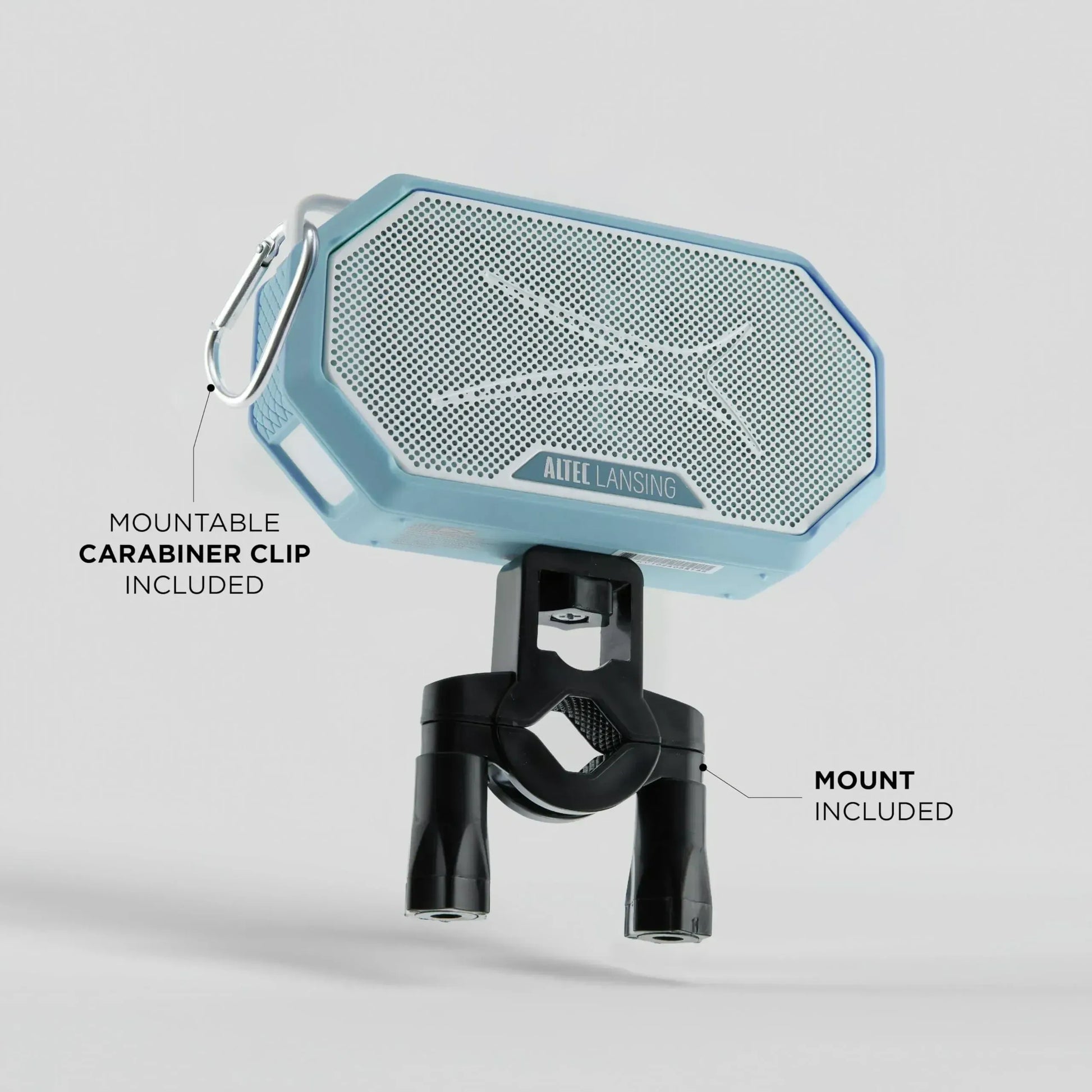 The Altec Lansing HydraMini 2.0 EverythingProof portable Bluetooth speaker is equipped with versatile features that will prepare you for every adventure. With up to 12 hours of battery life, you can enjoy your music for extended periods. The speaker is built with an IP67 EverythingProof rating, making it waterproof, dustproof, shockproof, and it even floats! Its portable design, including a built-in magnet, carabiner clip, and included speaker mount, allows you to easily attach it to bikes, backpacks, or metal surfaces. For double the sound, you can stereo pair two HydraMini 2.0 speakers together via true wireless pairing. The speaker's 8W RMS output and 2" Neo full-range drivers deliver rich, immersive audio with deep bass and crisp highs.