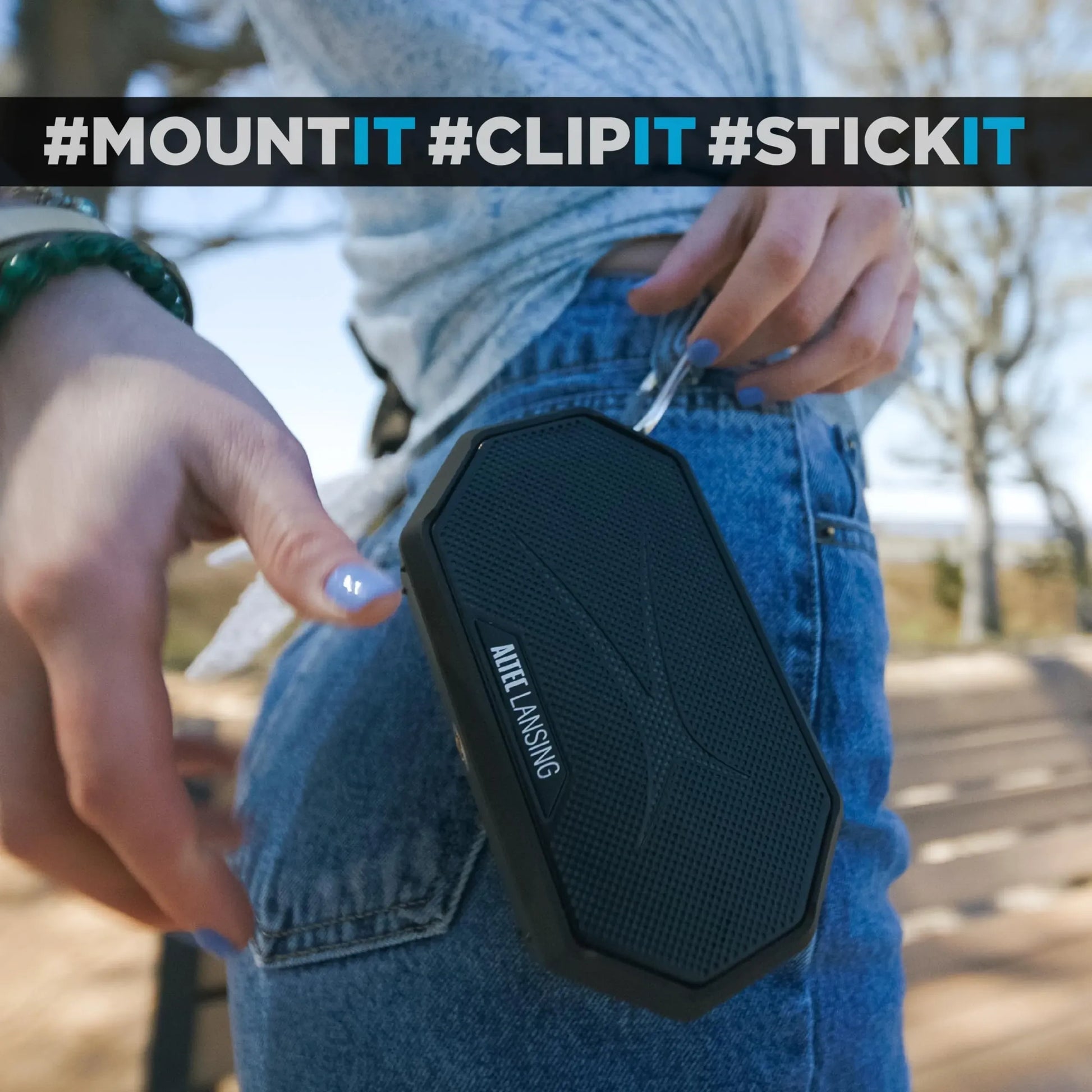 The Altec Lansing HydraMini 2.0 EverythingProof portable Bluetooth speaker is equipped with versatile features that will prepare you for every adventure. With up to 12 hours of battery life, you can enjoy your music for extended periods. The speaker is built with an IP67 EverythingProof rating, making it waterproof, dustproof, shockproof, and it even floats! Its portable design, including a built-in magnet, carabiner clip, and included speaker mount, allows you to easily attach it to bikes, backpacks, or metal surfaces. For double the sound, you can stereo pair two HydraMini 2.0 speakers together via true wireless pairing. The speaker's 8W RMS output and 2" Neo full-range drivers deliver rich, immersive audio with deep bass and crisp highs.