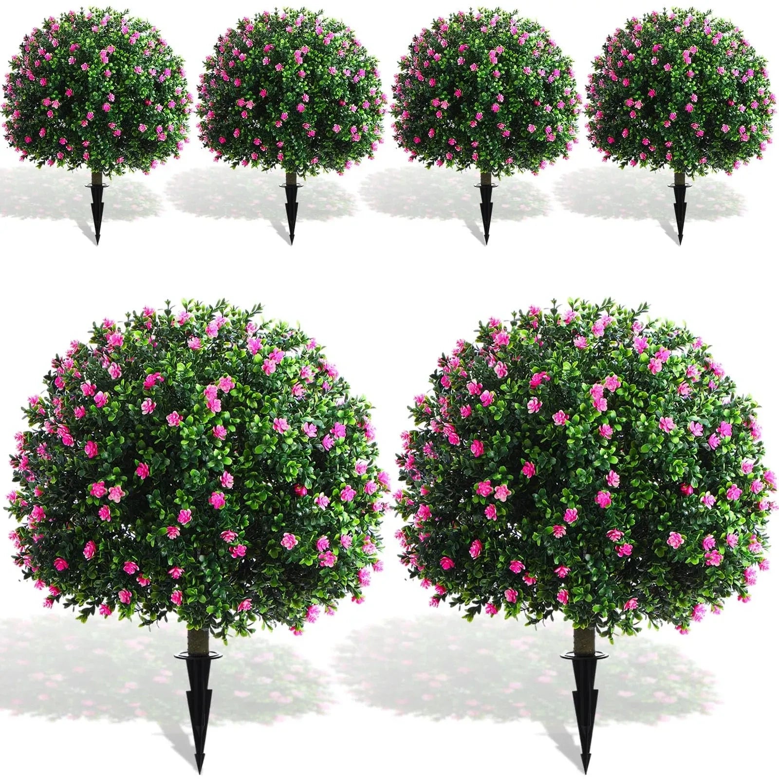 This set includes 6 Yunlly Artificial Boxwood Topiary Balls, each 27 inches, perfect for outdoor and indoor decor. These realistic, UV-resistant faux bush balls feature spikes for easy placement in your garden, porch, or patio, adding a touch of pink color and maintenance-free greenery.