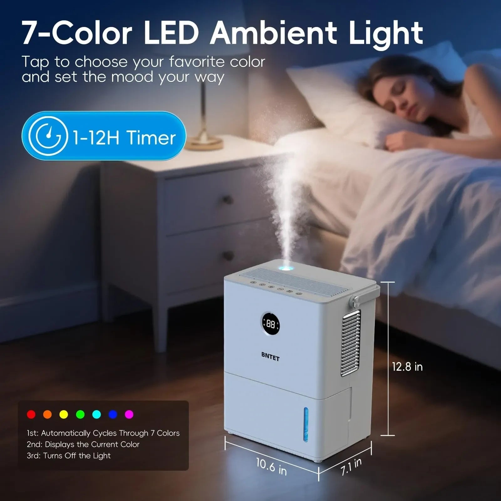 The BNTET 2-in-1 Dehumidifier and Humidifier Combo (Model: HC2468) is an innovative appliance designed to maintain optimal indoor air quality by managing both moisture removal and moisture addition. This unit features a large 68 oz (2-liter) water tank and uses advanced cooling technology for rapid dehumidification (often citing a 30-second start-up time). Unlike dedicated units, it offers the flexibility to switch to a humidifier mode when the air is too dry. Key features include Smart Humidity Control to automatically maintain a set humidity level, a 12-Hour Timer, an Auto Shutoff safety function, and a decorative 7-Color LED Light for ambient lighting, making it perfect for bedrooms, offices, and small living areas.