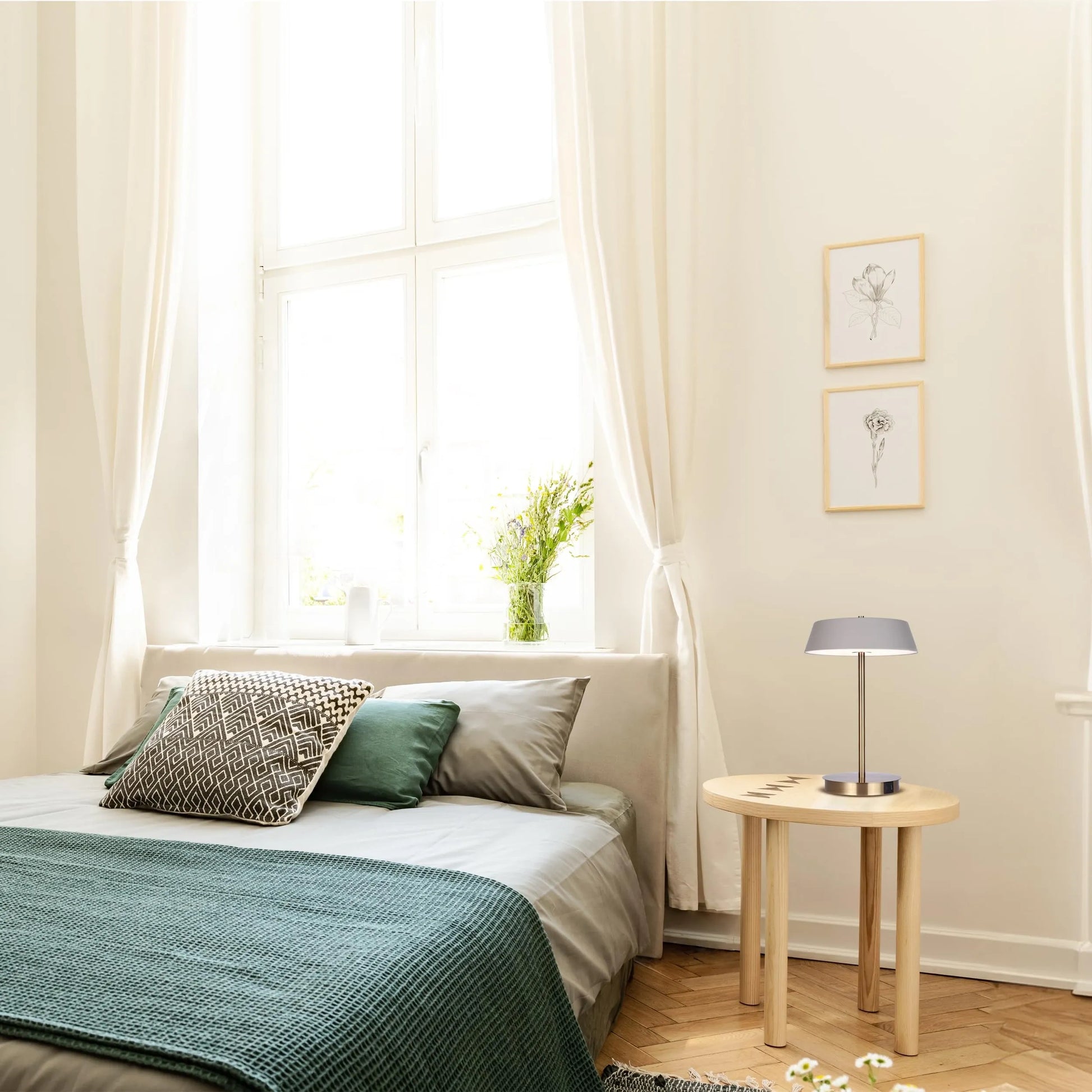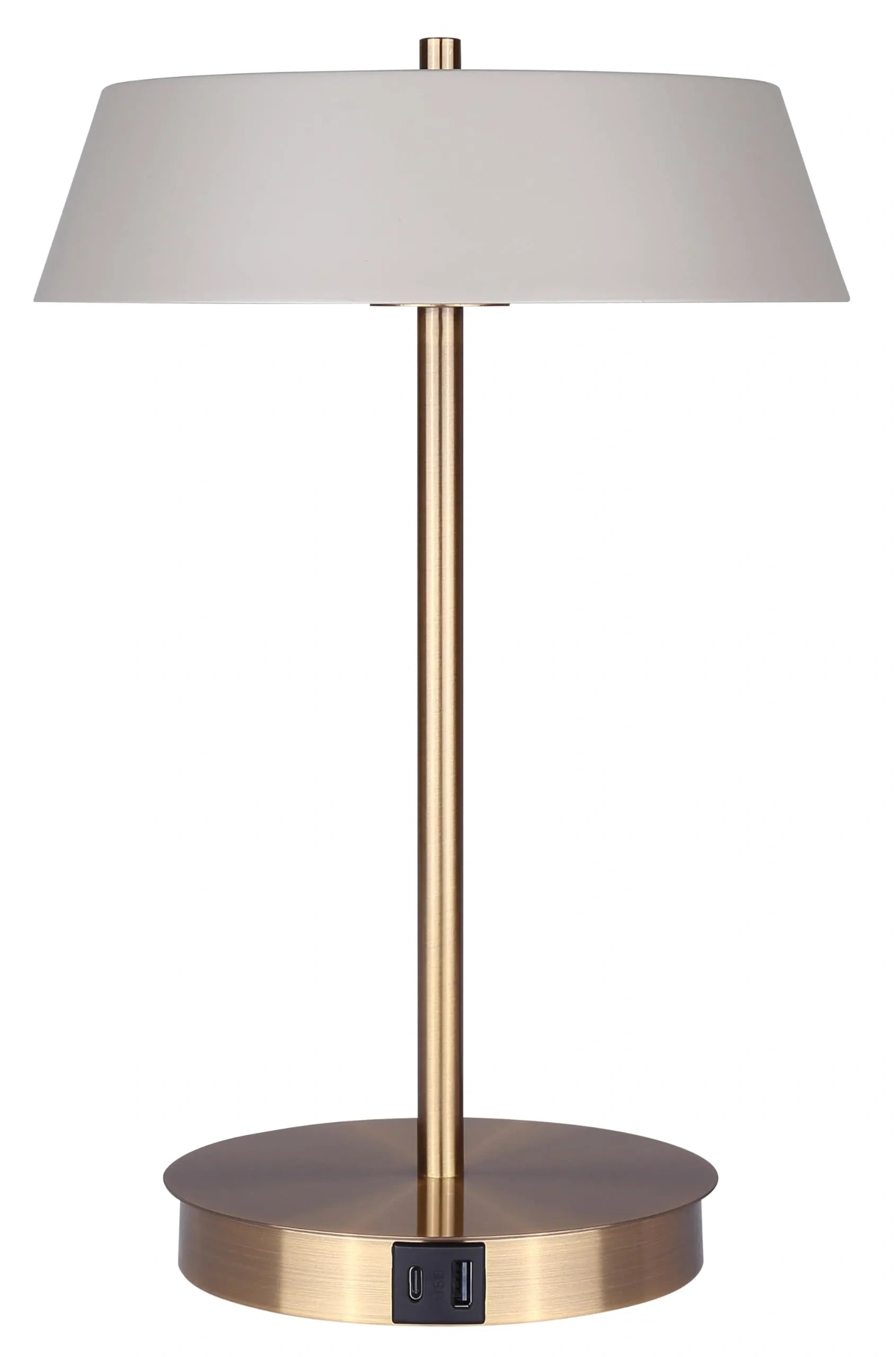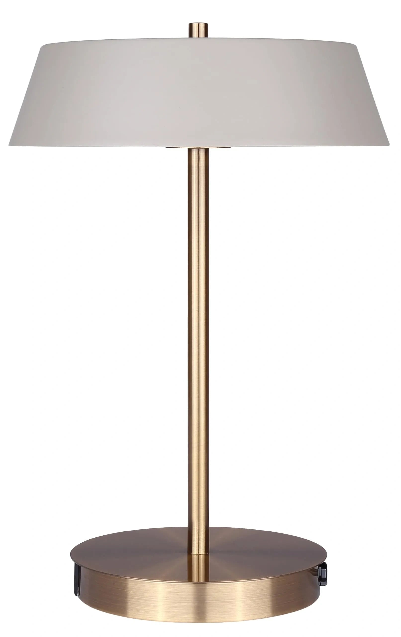 The Canarm Jessa 14-Inch Integrated LED Table Lamp is a modern lighting solution perfect for a desk or bedside table. It features a grey metal shade with a gold base, a touch on/off function, and convenient USB ports.
