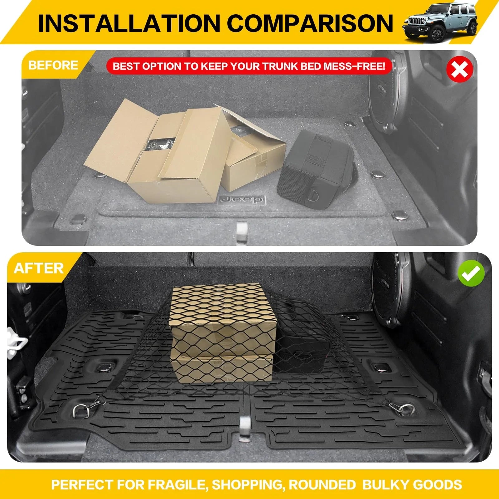 - It also comes with a Trunk Net designed specifically for the 2021-2024 Jeep Wrangler JL 4XE model, helping to secure loose items during transit
