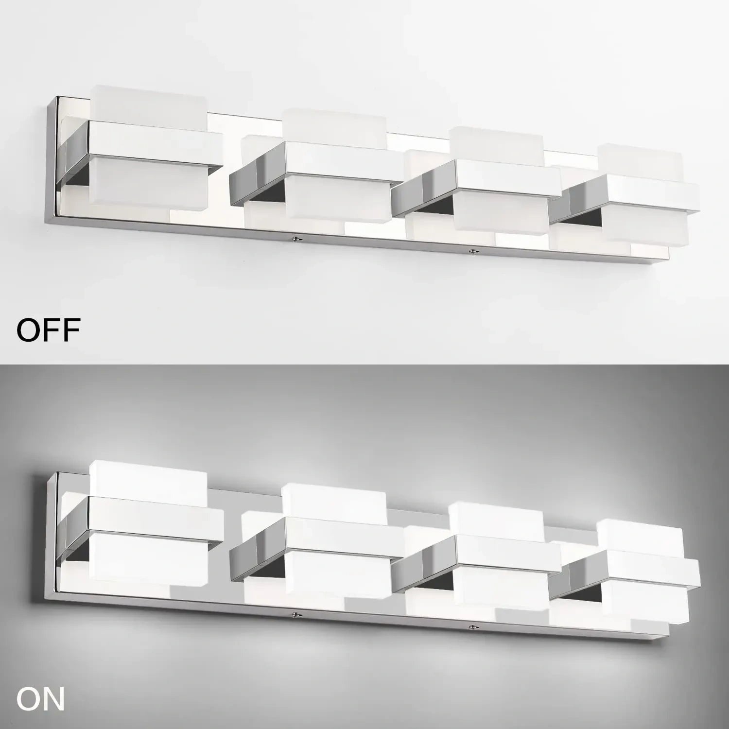 The SOLFART Modern LED Vanity Light is a sleek, 27-inch bathroom fixture designed to provide bright, even illumination over your mirror. Featuring a high-quality Chrome-finished stainless steel base and frosted acrylic shades, this fixture delivers a crisp, cool white light that is perfect for grooming and makeup application. Its minimalist design fits seamlessly into contemporary or industrial bathroom decors. Built with integrated LED technology, it eliminates the need for bulb replacements while offering energy-efficient performance and dimmable functionality to set the perfect mood for your space.