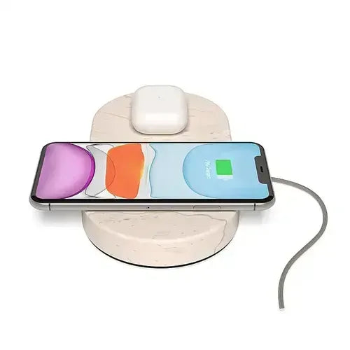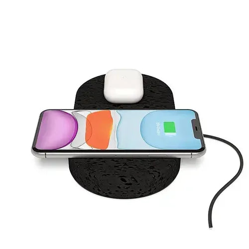 Elevate your charging experience with the Einova Dual Charging Stone, a beautifully designed wireless charger crafted from genuine lava stone. This unique and powerful charging pad allows you to simultaneously power up two Qi-enabled devices, making it an ideal solution for couples, families, or anyone with multiple devices. Its natural lava stone surface not only adds a touch of organic elegance to your space but also provides a stable, non-slip base. With up to 10W of fast wireless charging power per pad (20W total output), the Dual Charging Stone ensures quick and efficient power delivery, combining sophisticated aesthetics with cutting-edge technology to keep your devices ready to go.