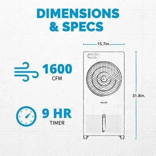 The Newair Portable Evaporative Air Cooler with CycloneCirculation provides robust and quiet cooling, making it an ideal, eco-friendly alternative to traditional air conditioning for large, dry spaces. Featuring a powerful 1600 CFM fan, this unit can effectively cool areas up to 1076 square feet. Its innovative design includes three honeycomb cooling pads for maximum air intake, a top-loading reservoir for adding water and ice for enhanced cooling, and a 3.16-gallon removable water tank for easy, mess-free refills. With a lightweight, portable design and easy-roll casters, you can effortlessly move this unit to provide relief in your bedroom, home office, or even outdoor living areas.