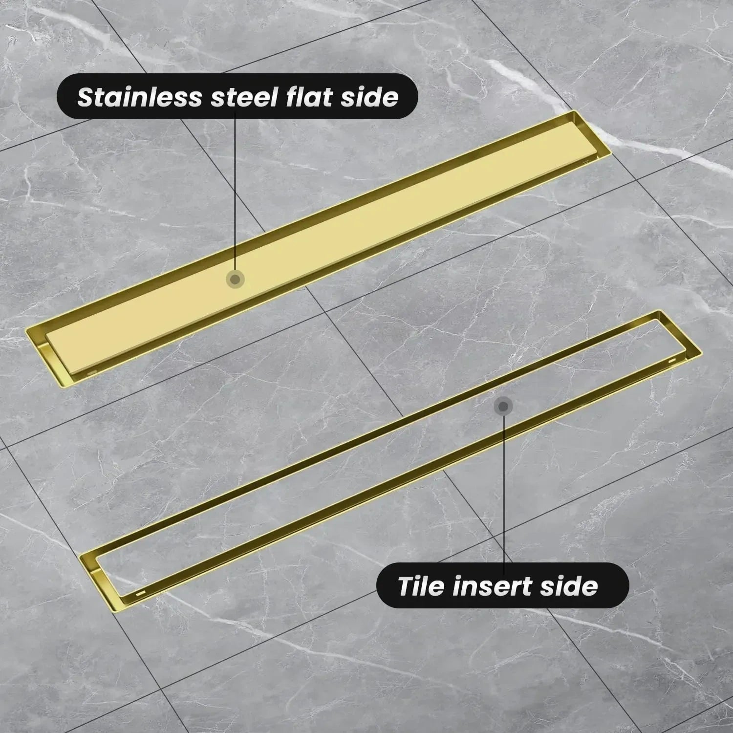 - Reversible Cover - Features a 2-in-1 grate: one side is flat Brushed Gold, and the other is a Tile Insert recess for an invisible, tiled-in look.
