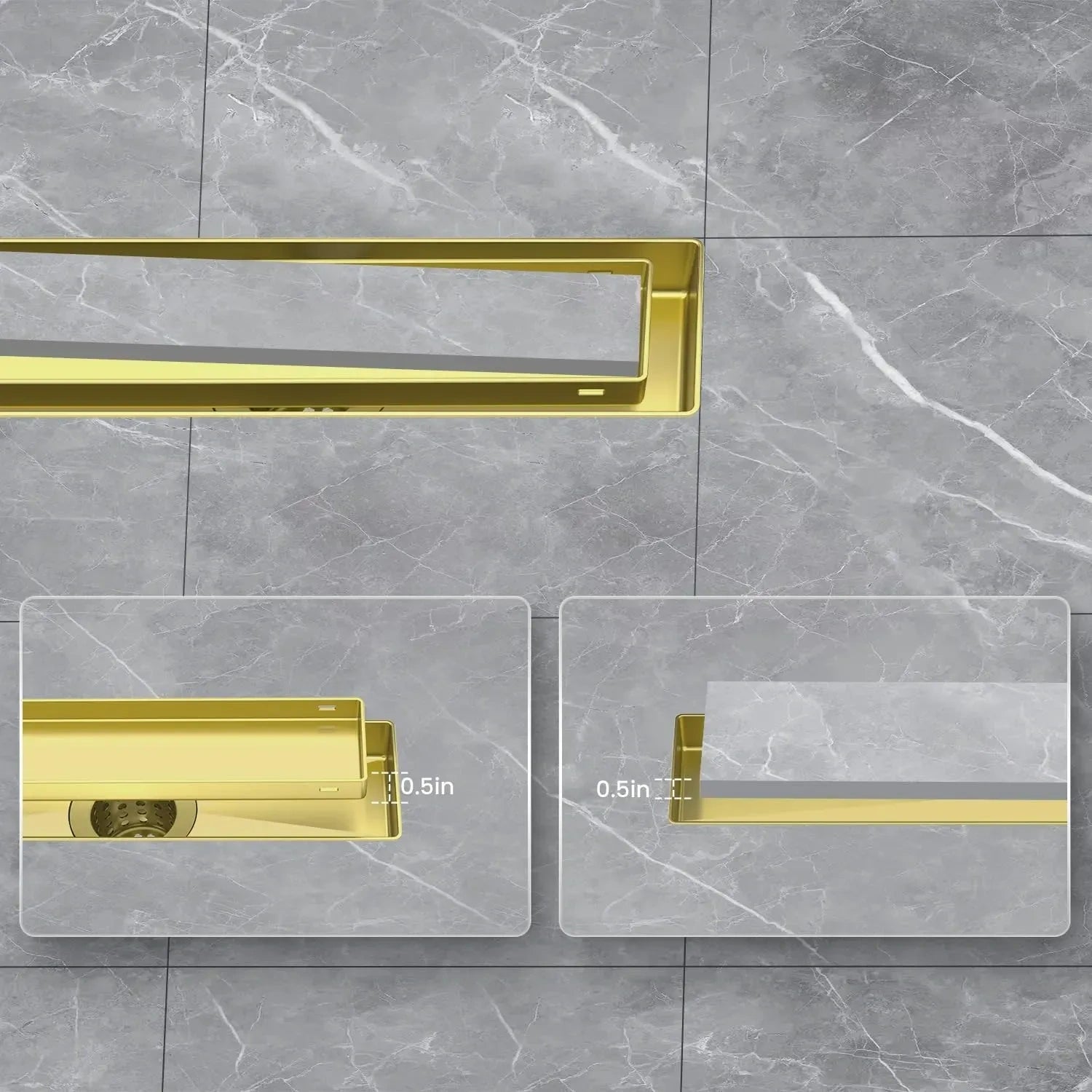 Elevate your bathroom's design with the EXF Offset Linear Shower Drain. This sleek, 36-inch rectangular drain is constructed from premium 304 Stainless Steel and features a luxurious Brushed Gold finish that adds a touch of modern elegance to any walk-in shower. The drain's key feature is its Reversible Tileable Cover, allowing you to seamlessly match the drain to your floor tiles for an almost invisible appearance, or flip it over for a contemporary flat metal look. The offset design is ideal for installations where the main plumbing cannot be centered, simplifying the process. Complete with a removable hair catcher and adjustable leveling feet, this drain combines high flow, anti-clogging functionality with easy, precise installation.