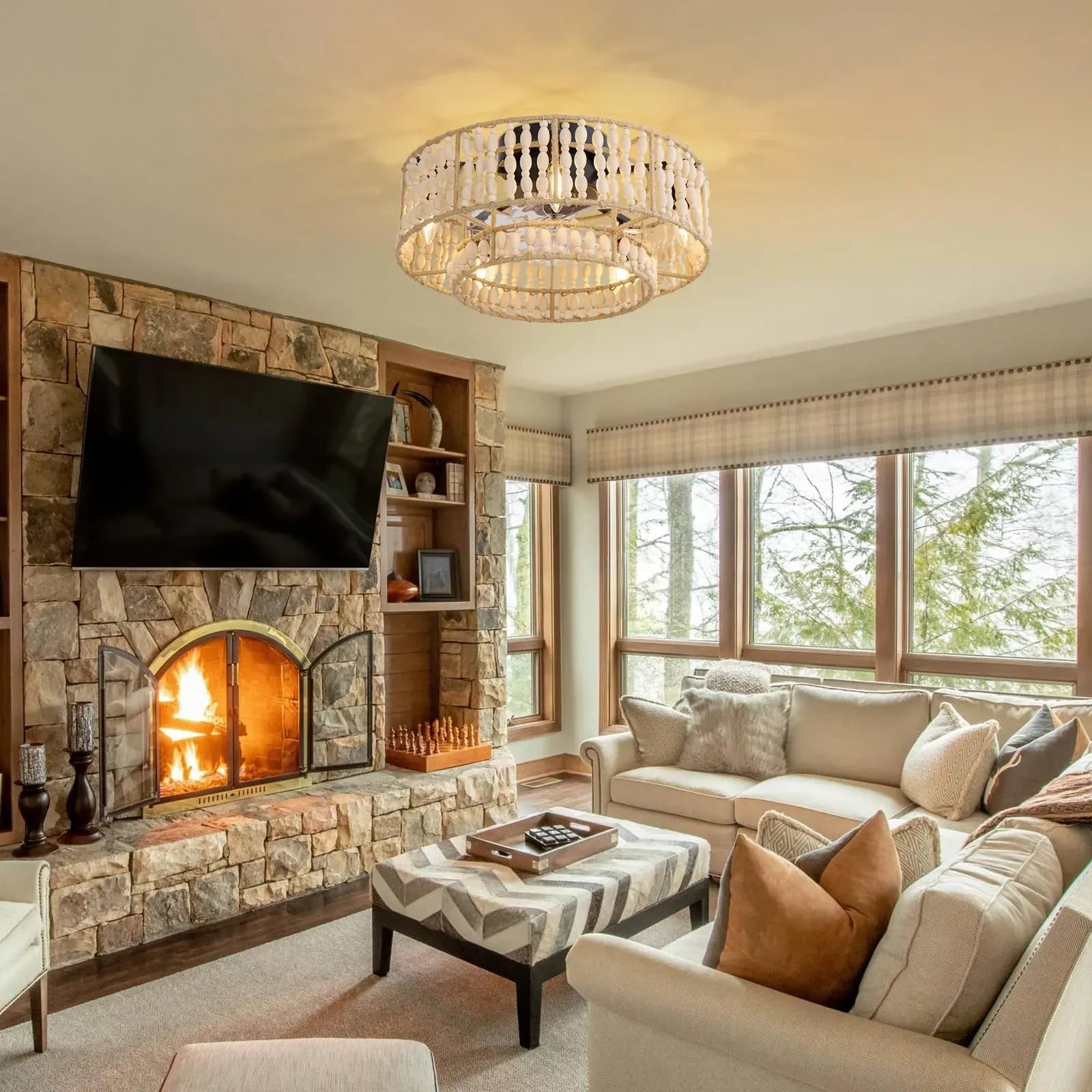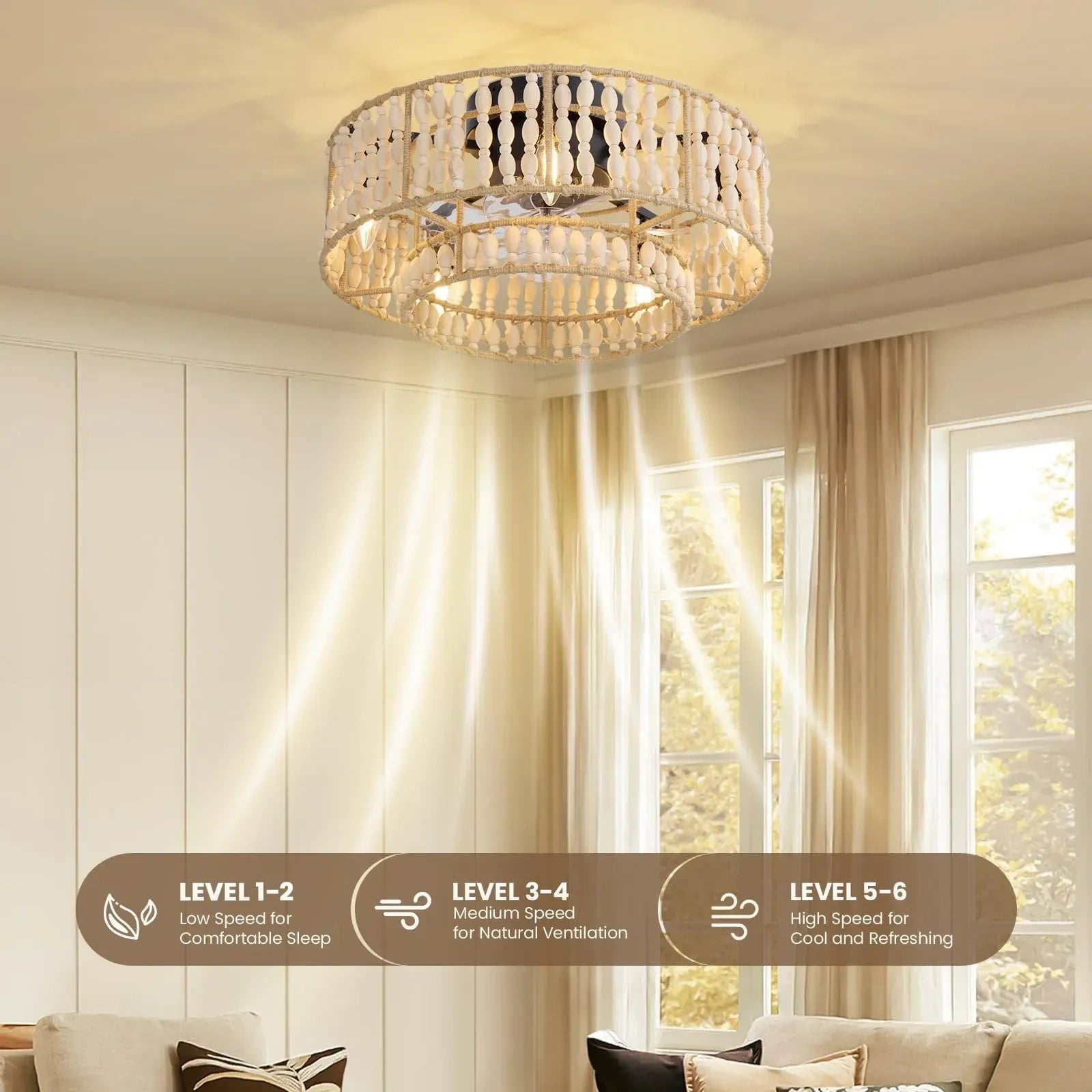 Add a warm, bohemian touch to your home with the Fansconce Boho Caged Ceiling Fan with Lights. This stylish 20-inch flush mount ceiling fan features a unique Layered Rattan housing adorned with decorative Wood Beads in a natural finish, creating a captivating, coastal-inspired design. Perfect for smaller spaces like a Bedroom, Nursery, or Living Room, this fan includes a dimmable light fixture at its core. It operates using an energy-efficient motor that offers 6 Reversible Speeds, allowing you to easily adjust airflow for cooling in the summer and heat circulation in the winter. Control is made simple and convenient with the included wireless Remote.