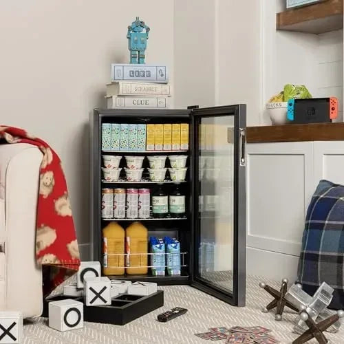 The Newair AB-1200 Freestanding Beverage Fridge is a compact, high-capacity cooler designed to keep all your favorite drinks perfectly chilled.1 Featuring a sleek stainless steel door frame, a transparent glass door, and a black body, this single-zone fridge holds up to 126 standard 12 oz. cans (equivalent to over 20 six-packs).2 It utilizes a powerful, yet quiet, compressor cooling system to reach temperatures as low as 3$37^\circ\text{F}$.4 The interior is highly customizable with removable and adjustable chrome wire shelves, allowing you to accommodate cans, bottles, and other odd-sized containers.5 Its freestanding design makes it the ideal supplementary storage solution for home bars, offices, dorm rooms, or game rooms.6