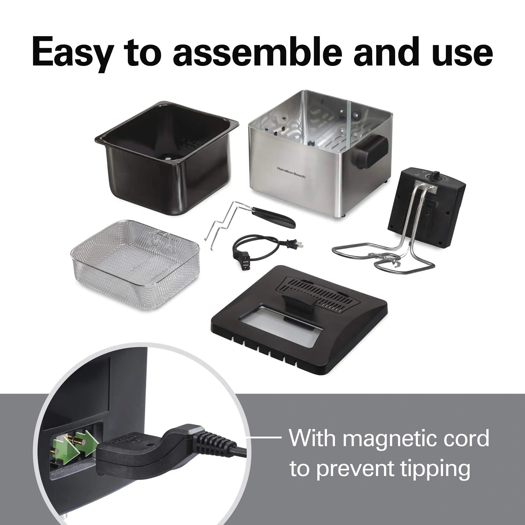 The Hamilton Beach Professional-Style Deep Fryer (Model: 35042) is inspired by commercial kitchen equipment, making it easy to create restaurant-quality fried foods for a crowd. It features a massive 5-liter (5.3 quart or 21 cup) oil capacity and a powerful 1800-watt immersed heating element that heats oil faster and maintains temperature throughout use. This extra-large capacity allows you to cook up to 13 servings of French fries in a single batch. Designed for both performance and convenience, the fryer includes an easy-pour oil spout and dishwasher-safe components for simple cleanup.