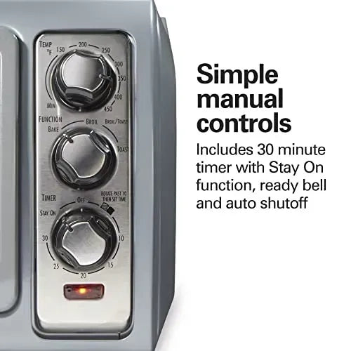 The Hamilton Beach Easy Reach Toaster Oven (Model: 31127D) is a versatile and uniquely designed countertop oven that maximizes convenience and usability. Its signature feature is the patented Roll-Top Door, which moves up and out of the way, giving you easy, unhindered access to food and preventing potential drips and spills on the door itself. This oven is highly spacious for its class, fitting up to 6 slices of toast, a 12-inch pizza, or a 9 in×11 in bake pan. It offers 3 cooking functions (Bake, Broil, Toast), operates with simple manual controls, and includes a 30 minute timer with Auto Shut-Off and a Stay On function.