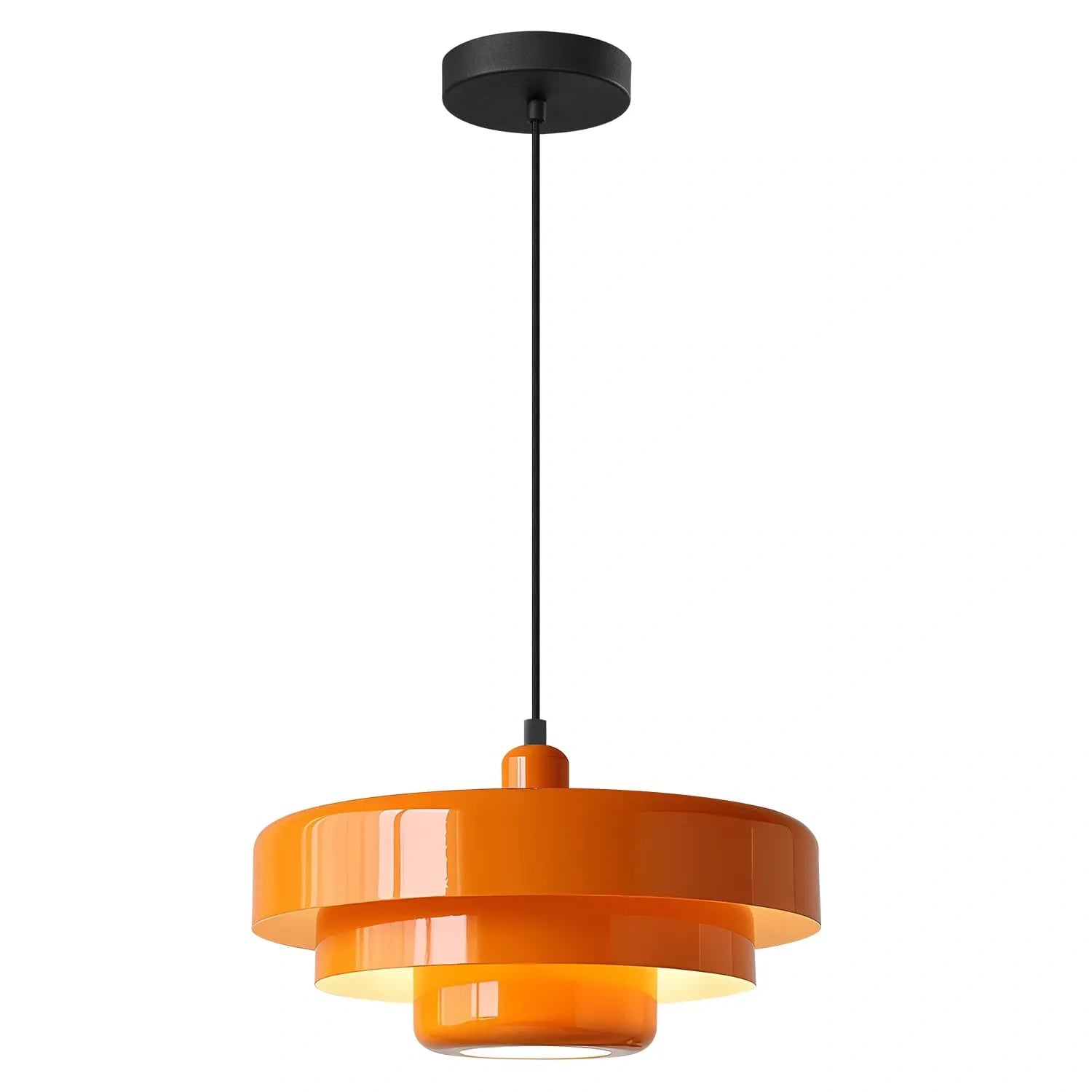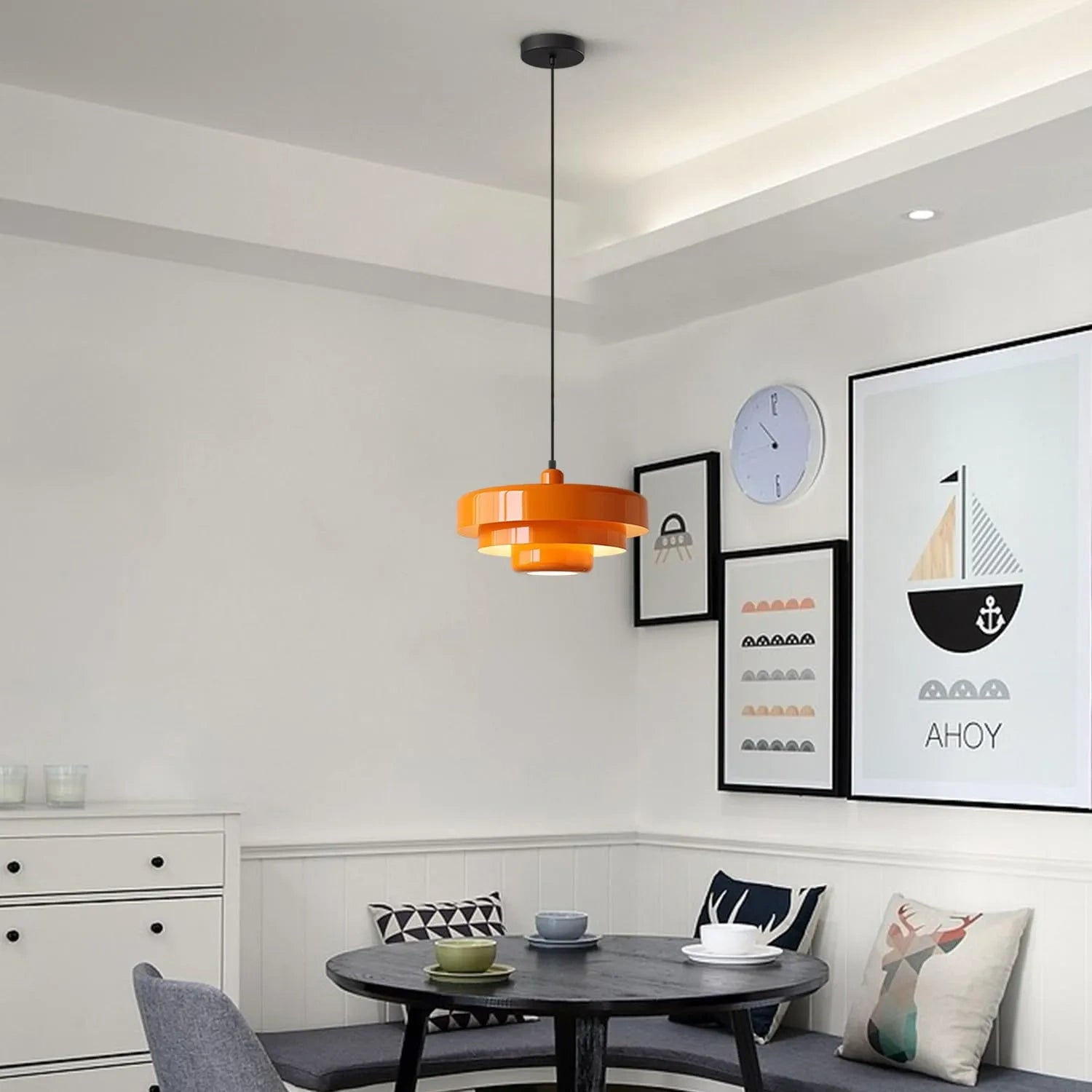 The Fulesi Large Mid Century Pendant Light features a Nordic Farmhouse design with a round, 3-tier metal white shade. This elegant pendant lamp is an ideal light fixture for spaces like the dining room, bedside, bar, or restaurant, adding a touch of modern farmhouse style.