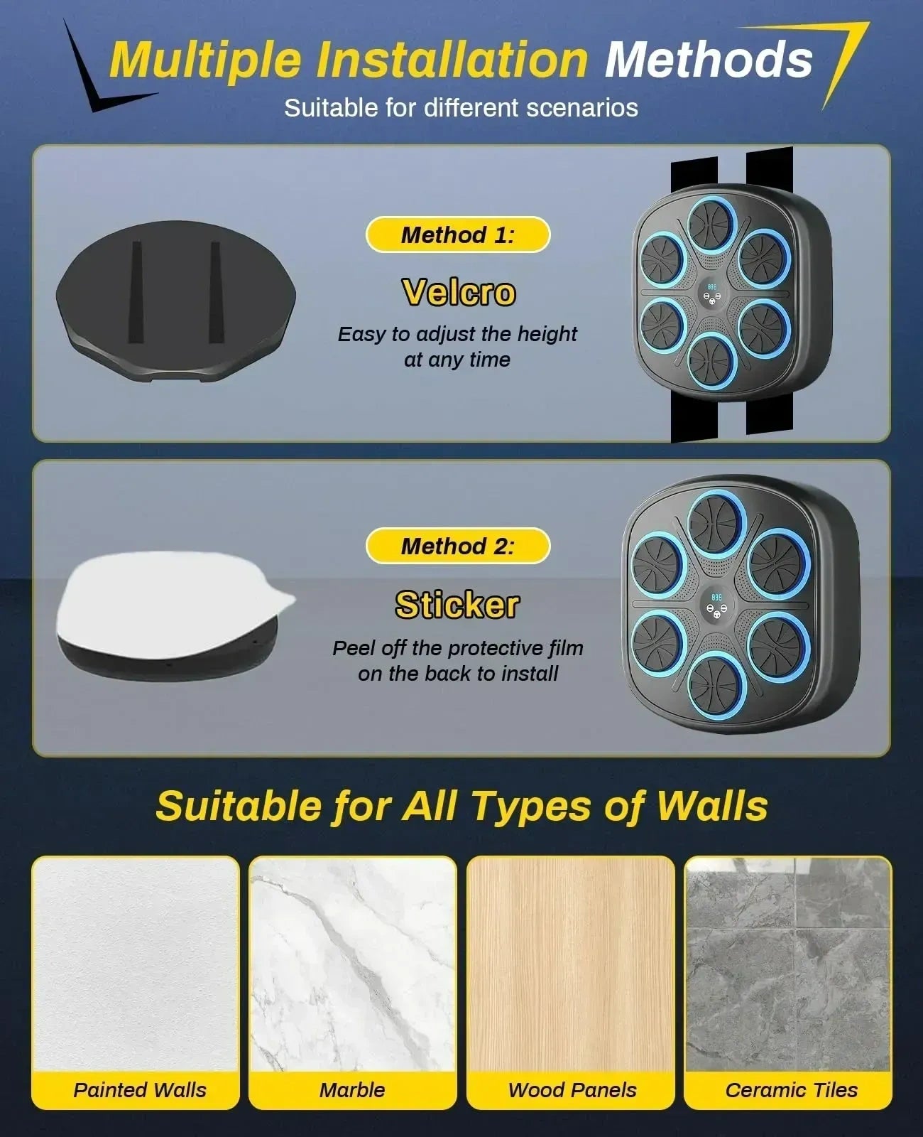 The Music Boxing Machine is an innovative, wall-mounted fitness system designed to provide an engaging cardio and coordination workout right in your home. This smart punching pad connects via Bluetooth to play your favorite music, while integrated LED lights cue you where to punch, challenging your reaction speed and hand-eye coordination. The impact surface is made of high-elastic foam, designed to absorb impact and feel realistic. It offers multiple modes and speeds, allowing both beginners and experienced users to enjoy a fun, high-energy workout that also serves as an excellent stress reliever. Its wall-mounted design is space-saving and allows for easy, no-drilling installation using strong adhesive tapes.