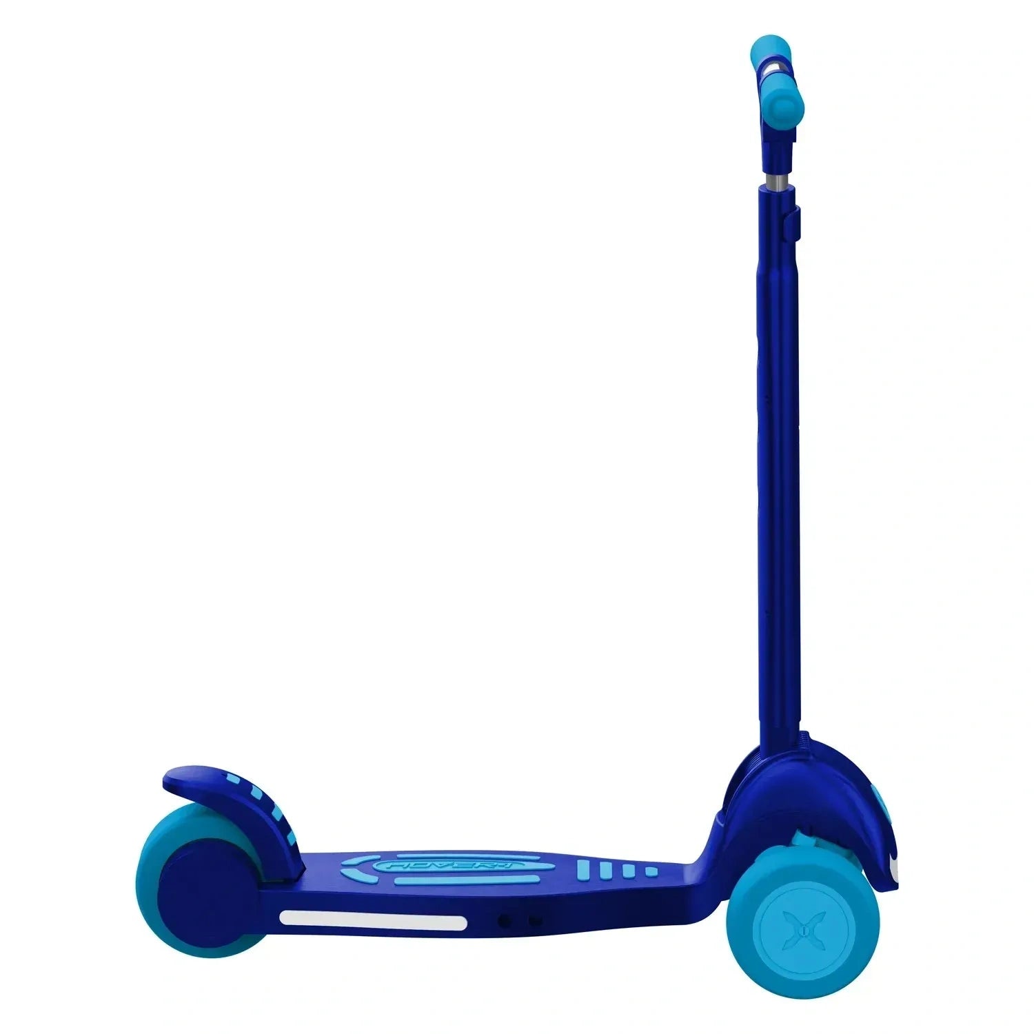 The Hover-1 My First Electric Scooter (Model: H1−MFSC−BLU) is the ideal training scooter for young beginners. Designed for children aged 5+ and up to 80 lbs, this scooter prioritizes safety and stability with its 3-wheel design and easy lean−to−turn axle. It is propelled by an 80W motor and features a simple thumb throttle, limiting the top speed to a safe 5-6 MPH and providing a range of approximately 2 miles. The scooter is lightweight and includes a foldable design for convenient storage, along with vibrant LED lights on the deck and front to enhance visibility and fun. It is UL 2272 certified.