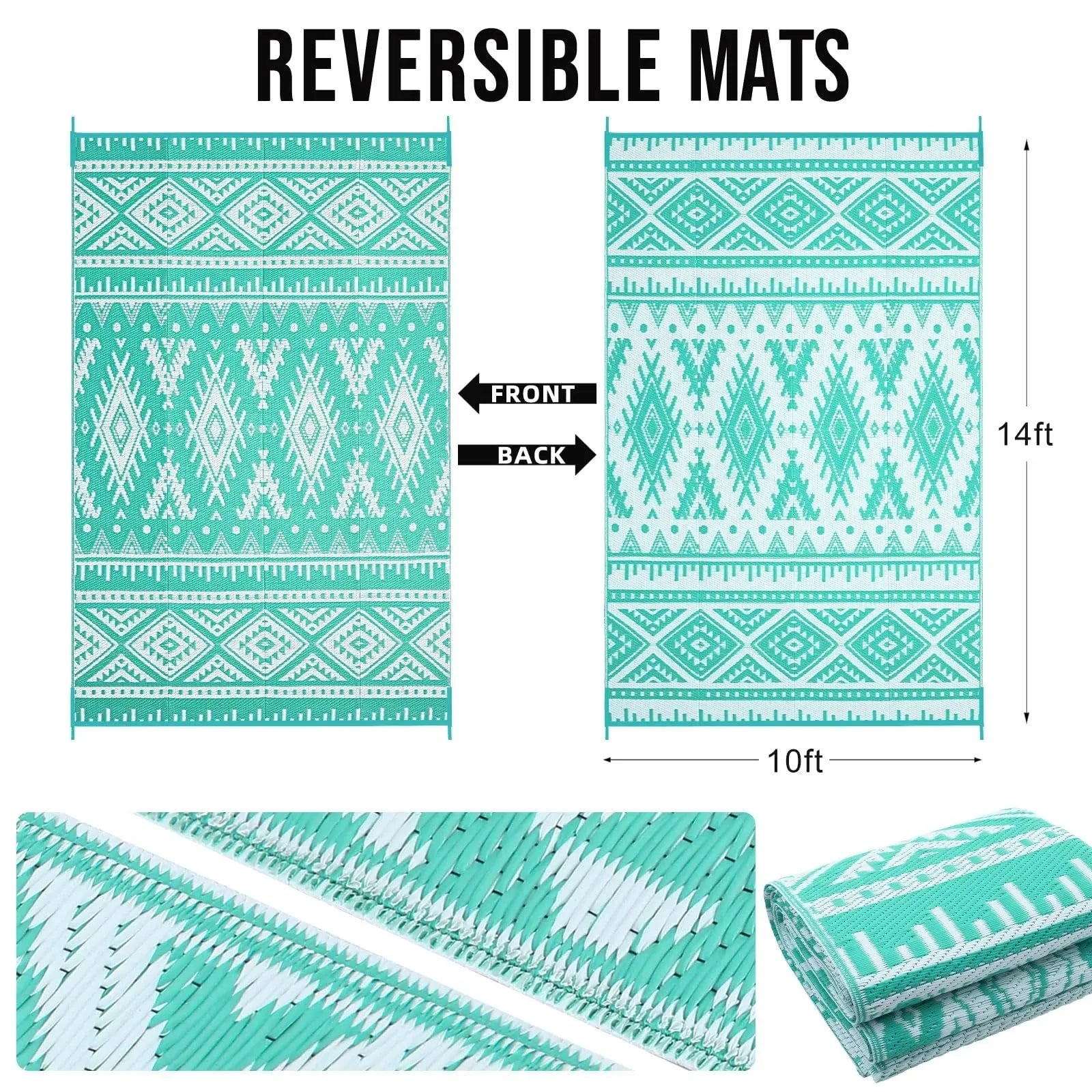 Bring style and durability to your large outdoor living area with the OLANLY Outdoor Rug. This expansive, reversible mat measures 10x14 feet, making it ideal for large patios, decks, or extensive RV setups. Crafted from tightly woven, weatherproof plastic straw (polypropylene), this rug is completely Waterproof and treated to resist UV damage. It showcases a chic Boho geometric pattern in a refreshing Turquoise and White color scheme. Because it is fully reversible, you get two distinct looks in one. The lightweight, foldable design and easy maintenance make this rug a perfect, versatile carpet for any outdoor space, including camping, picnics, and backyard parties.