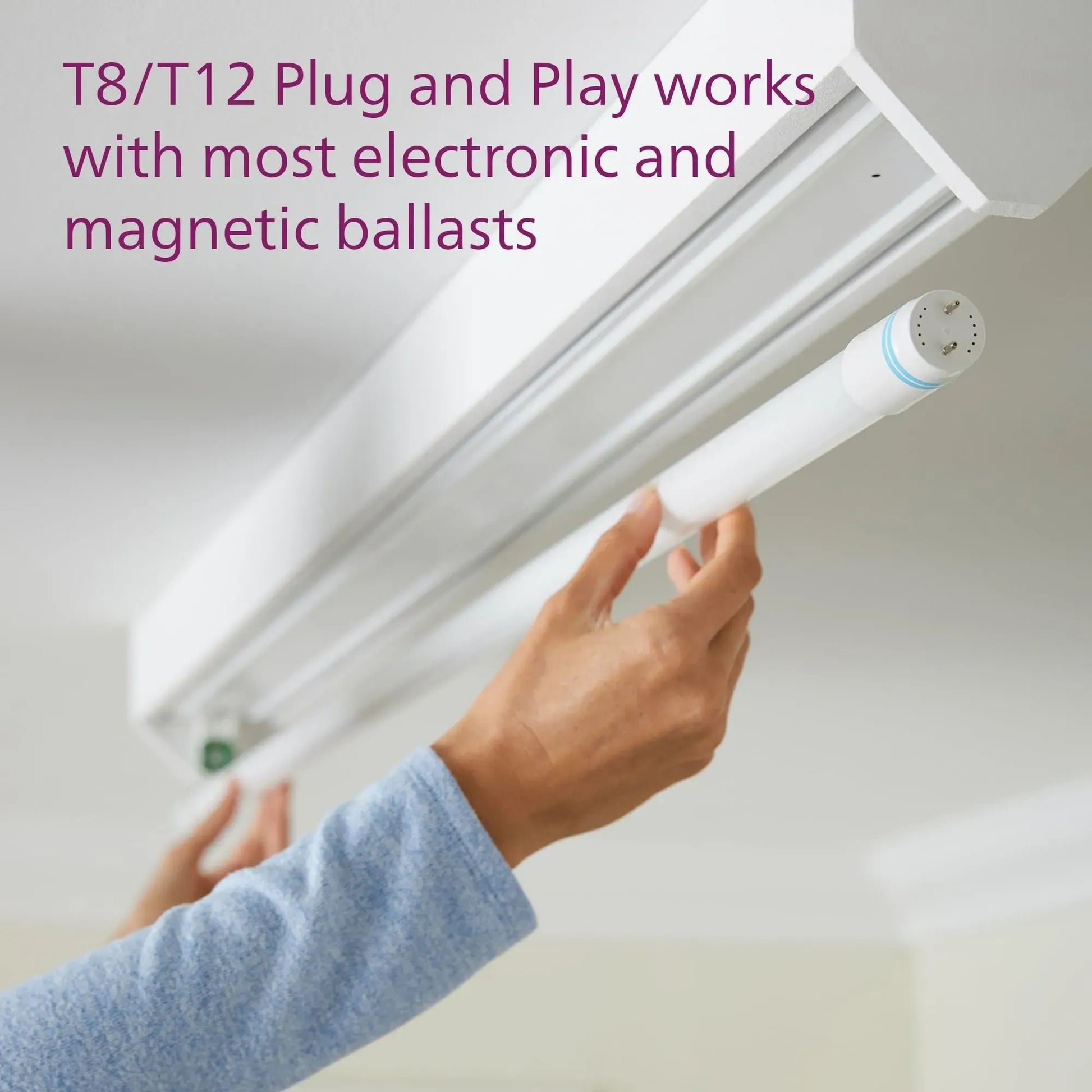 The Philips Plug and Play LED Tube (Model 591965) is a high-efficiency lighting solution designed to replace standard 48-inch T8 and T12 fluorescent lamps. This Type A bulb is "Plug and Play," meaning it works directly with most existing electronic ballasts, requiring no complex rewiring or bypass. The standout feature is the 5-CCT Selectable Color Technology, which allows you to toggle between five different white light temperatures (from Warm White to Daylight) using a switch on the bulb itself. This 10-pack is perfect for commercial or residential upgrades in garages, offices, and warehouses where customized lighting and energy savings are a priority.