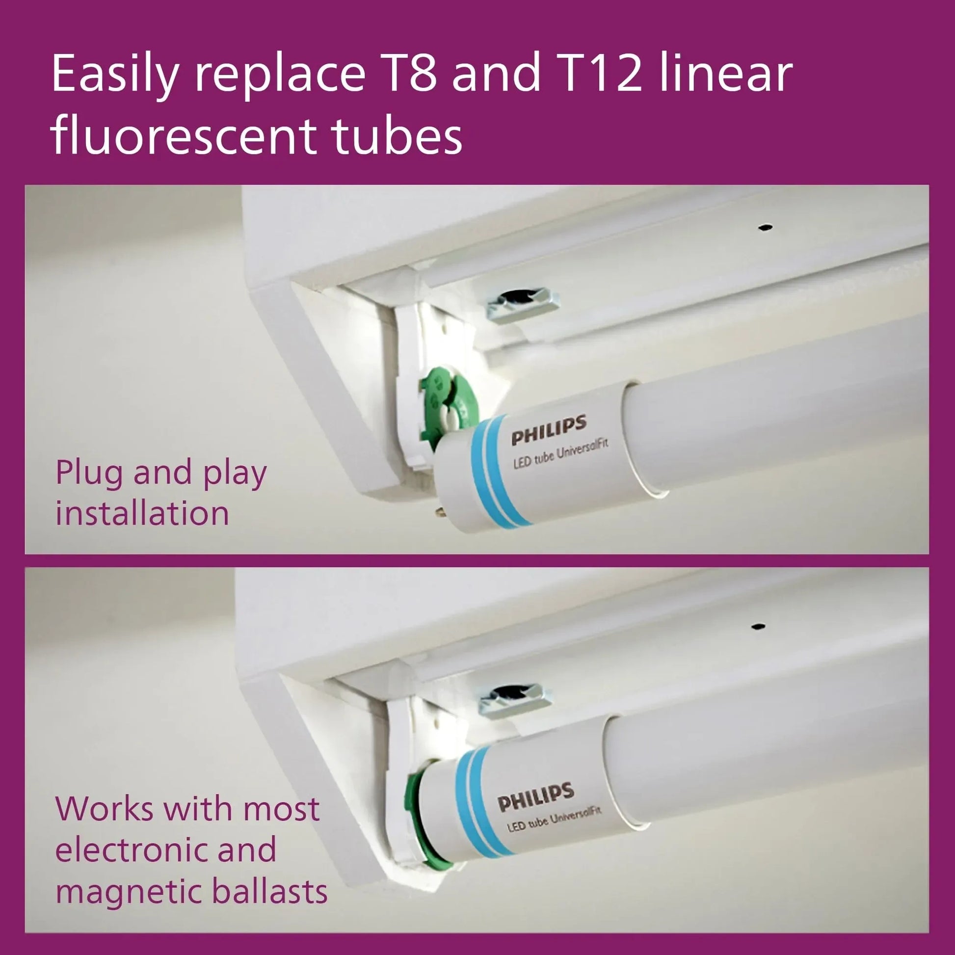 - Plug & Play (Type A) - Installs directly into existing fixtures without the need to bypass the ballast, making it the fastest way to upgrade to LED.