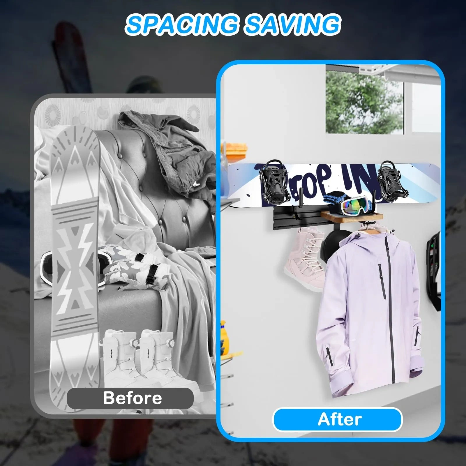 - This rack offers multifunctionality, serving as a versatile storage solution for not only snowboards but also skateboards and other related gear, ensuring all your equipment is neatly organized and readily accessible.
